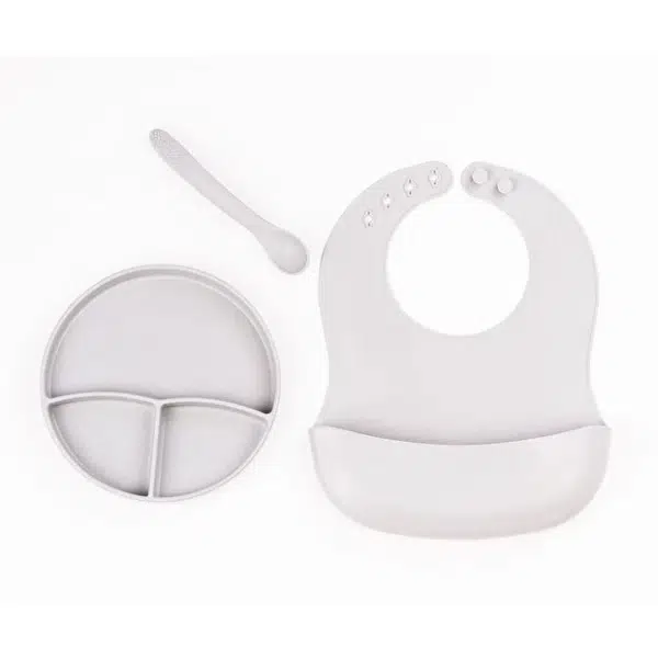 SANEC Gri 3’lü Silikon Yemek Seti – Önlük + Diş Kaşıyıcılı Kaşık + Vakumlu Tabak